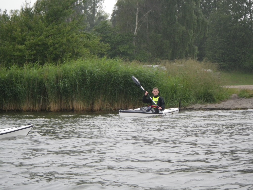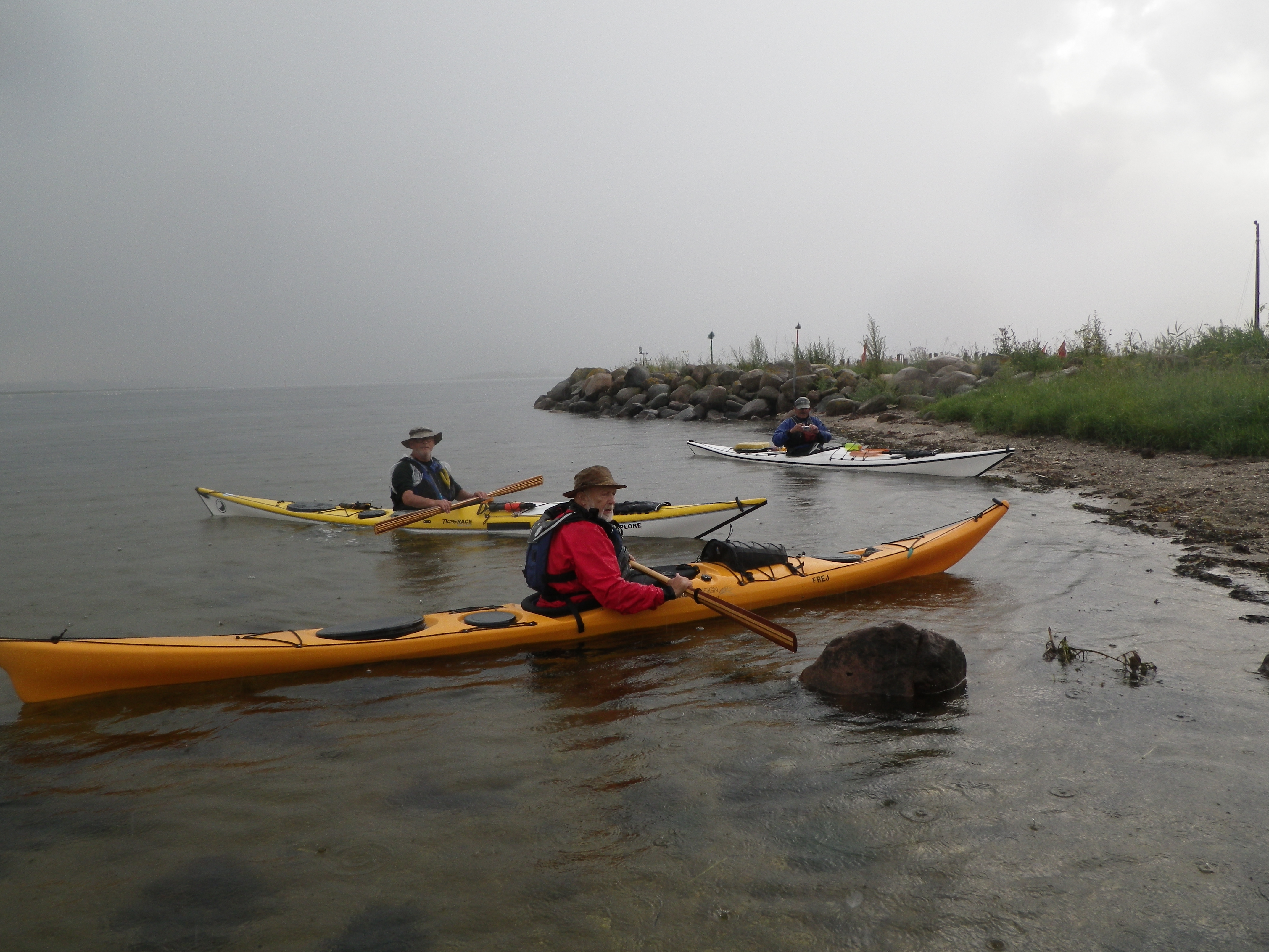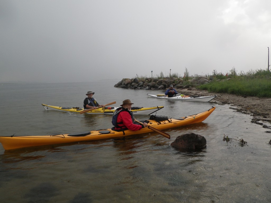 Vi var hurtigt på vandet og roede mod syd i let modvind. Vejret var overskyet og der var enkelte regnbyger. Især ved Østbyhavn kom der en større byge, men det forhindrede os ikke i at tale kajak under roturen. De tre fra Kajakhornsherred fortalte, at de gerne ror ture på omkring 20 kilometer og foretrækker at nyde roturerne frem for at få kilometer i armene. Det ser også ud som om, at det sociale vægtes højt, når turberetningerne læses på deres forum. Meget sympatisk. De fortalte også om deres kommende tur til Sverige, hvor de i slutningen af august vil ro på søen Bolmen nord øst for Helsingborg. Jeg har ikke roet så meget i søer med havkajak, men området ser da spændende ud.